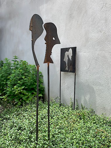 Dieses „ Spiel“ lässt sich fortsetzen in ihren wetterbeständigen Außenbildern. Sie stehen im freien Raum, in Gärten und Parkanlagen. Es sind keine Skulpturen, sondern zweidimensionale Malereien, die in einzigartiger Weise mit ihrer natürlichen Umgebung korrespondieren und die innere Diskussion am Leben erhalten.